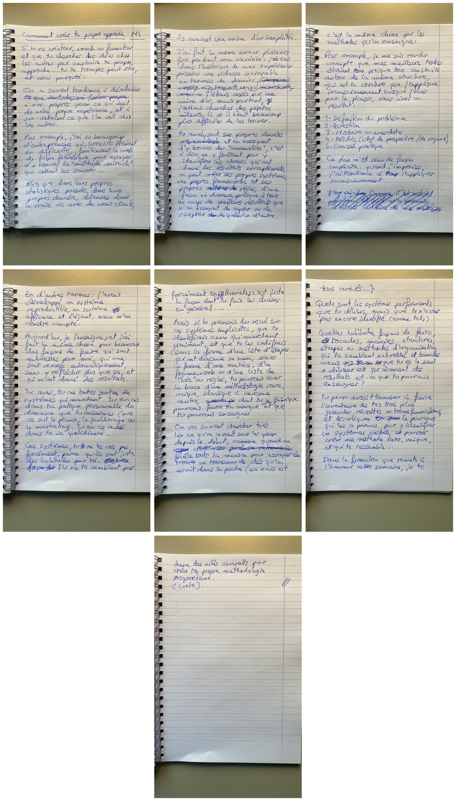 Mais si tu prenais du recul sur ces façons de faire, que tu isolais celles qui marchent le mieux et que tu les codifiais (sous la forme d'une liste d'étapes qui ont chacune un nom, ou sous la forme d'une matrice, d'un framework ou d'une liste de "lois" ou règles...) tu pourrais construire la base d'une méthodologie rare, unique, identique à aucune autre, dont tu pourrais faire ta marque et que tu pourrais enseigner.