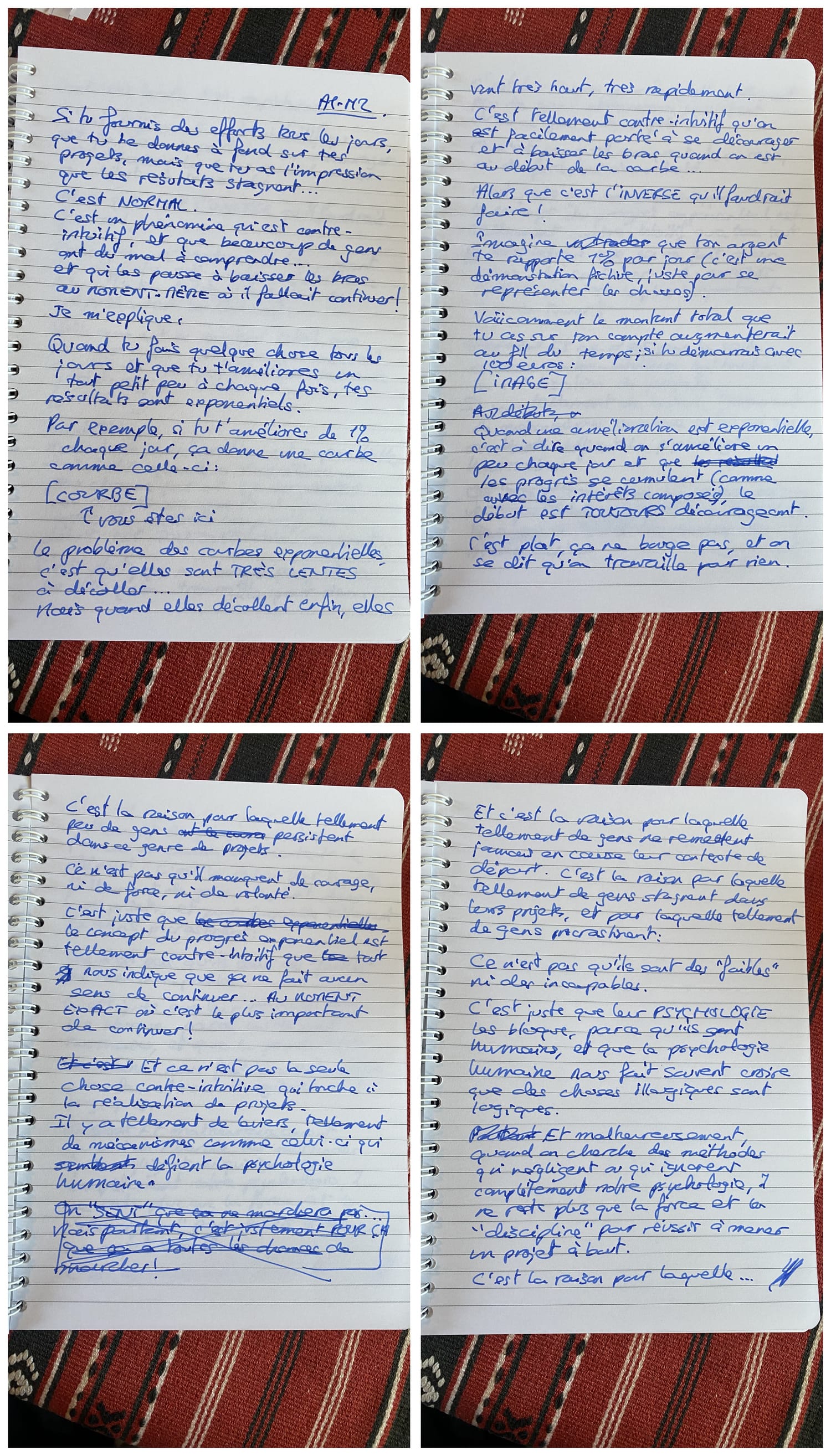 Tu le vois : quand une amélioration est exponentielle, c'est-à-dire quand on s'améliore un peu chaque jour et que les progrès se cumulent (comme avec les intérêts composés), le début est TOUJOURS décourageant.