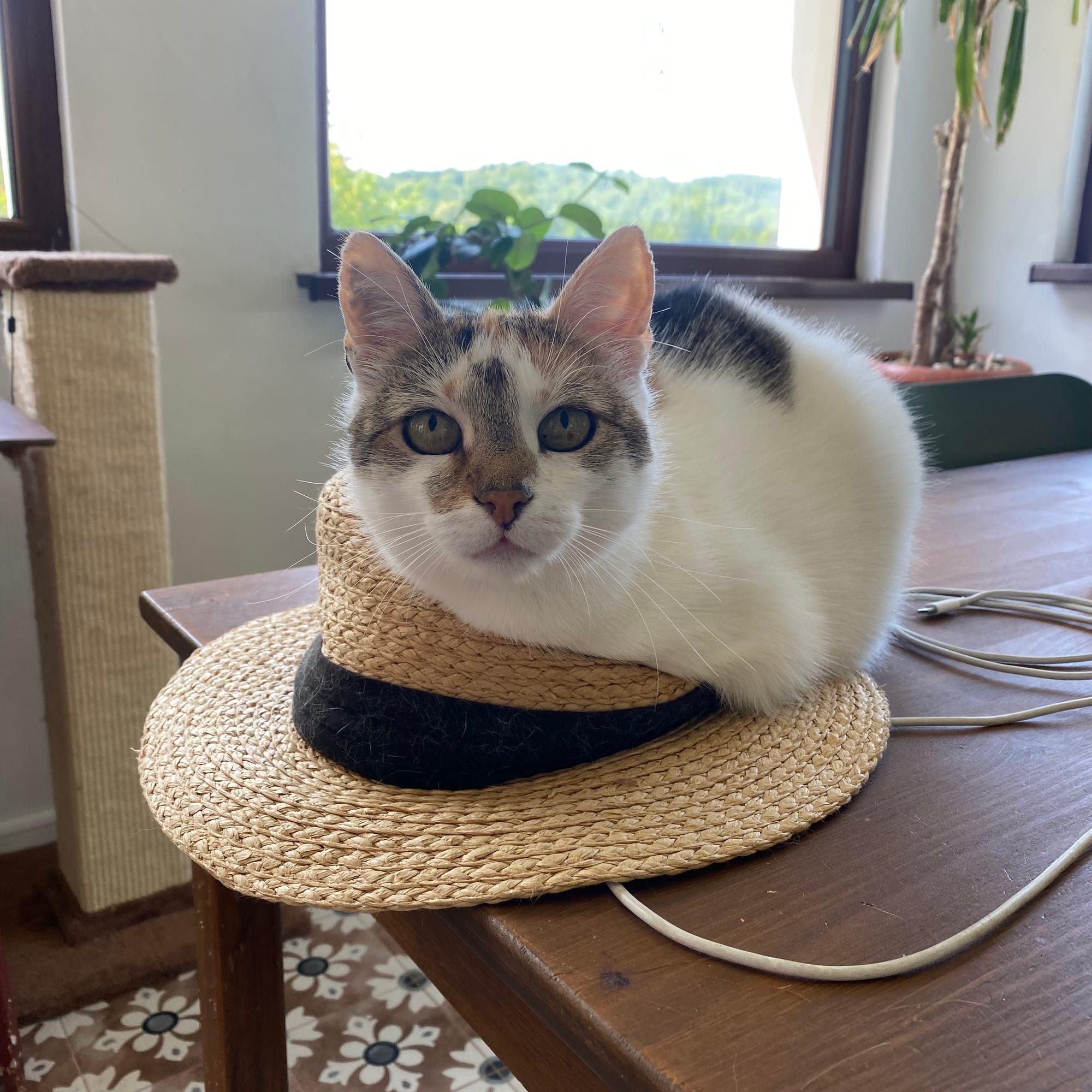 Et pour finir, une photo de Chacha, qui m'a assisté dans le travail sur ce projet, et qui aime s'asseoir sur ce chapeau de paille que j'utilise au jardin :