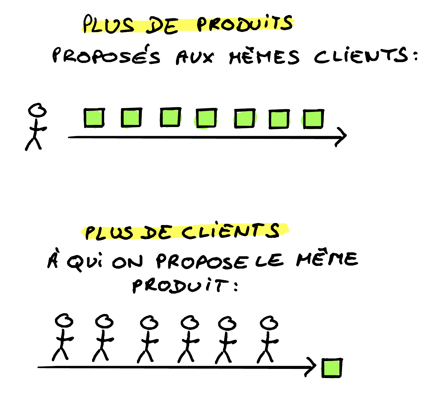 Dans ce modèle (le premier, sur le schéma), si une personne achetait un produit et en était satisfaite, alors la façon la plus simple de faire une vente supplémentaire était de lui proposer un AUTRE produit du même type la semaine d’après. Puis celle encore d’après et ainsi de suite, 52 semaines par an.